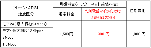 | インターネット接続料金は,現行の料金と同様の1,500円です。(初期費用1,000円) (おトクなセット割引も適用) お申込者が九州電話マイラインプラス3区分(市内・県内市外・県外)にご登録されている場合には,自動的に月額料金を980円に割り引く「九州電話マイラインプラス割引」も,従来同様適用されます。 (このほかNTT西日本の「フレッツ・ADSL」に係る月額利用料金や初期費用が必要となります。) |