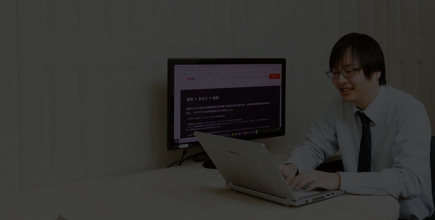 大学では物理学を専攻し、主に原子核や元素などの研究をしていました。就職活動にあたって、大学で学んだこととは別の分野で働きたいと思っていたので、専攻の内容はQTnetの事業内容や担当している業務と直接的な接点はありません。学んだことが直接業務に繋がらなくても、論理的な思考力などこれまで培ったものは活かすことができるのではないかと考えました。また私は、知りたい、学びたいという思いが人一倍強い性格です。IT業界は常に新しいことを勉強できる分野だと思い、QTnetに興味を持ちました。QTnetを志望したのは、就職活動を始めた頃に参加したインターンシップがきっかけです。2016年に起きた博多駅前道路陥没事故の際、使命感をもってインフラ復旧に臨んだ社員の方たちの話に感銘を受け、私もそういう仕事をしてみたいと思うようになりました。また、ITとひと言で言っても、QTnetの業務内容は多岐にわたります。ケーブルにはじまり、ネットワーク、ソリューション、運用などさまざまな分野を手がけている点も魅力を感じました。